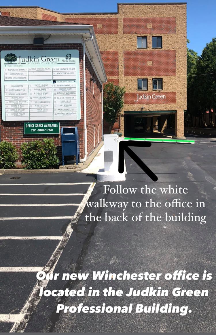 We have two convenient office locations, one in Winchester, MA and one in Woburn, MA. The Winchester office is located at 63 Shore Road, Unit 32, Winchester, MA. and the Woburn office is located at 8 Cedar Street, Unit 64, Woburn, MA.